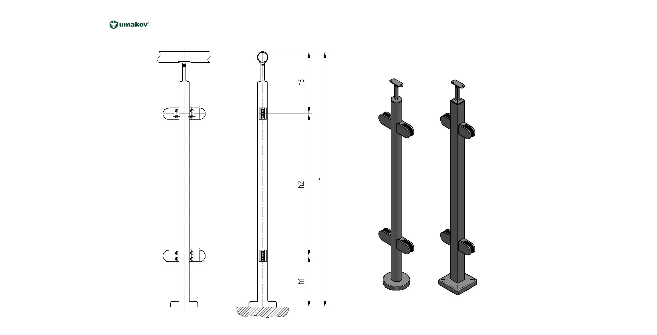 Baluster post inox AISI304, D42,4x2/4xmodel22/H110 A-VR110-4G90