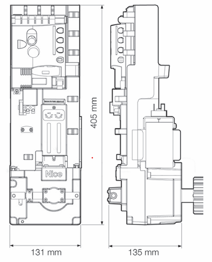 Sada pohonu NICE pro posuvné brány max. 400 kg (doporučená hmotnost samonosné brány 200 kg, kolečkové 300 kg). V balení motor NKSL400 s elektronikou NKA3