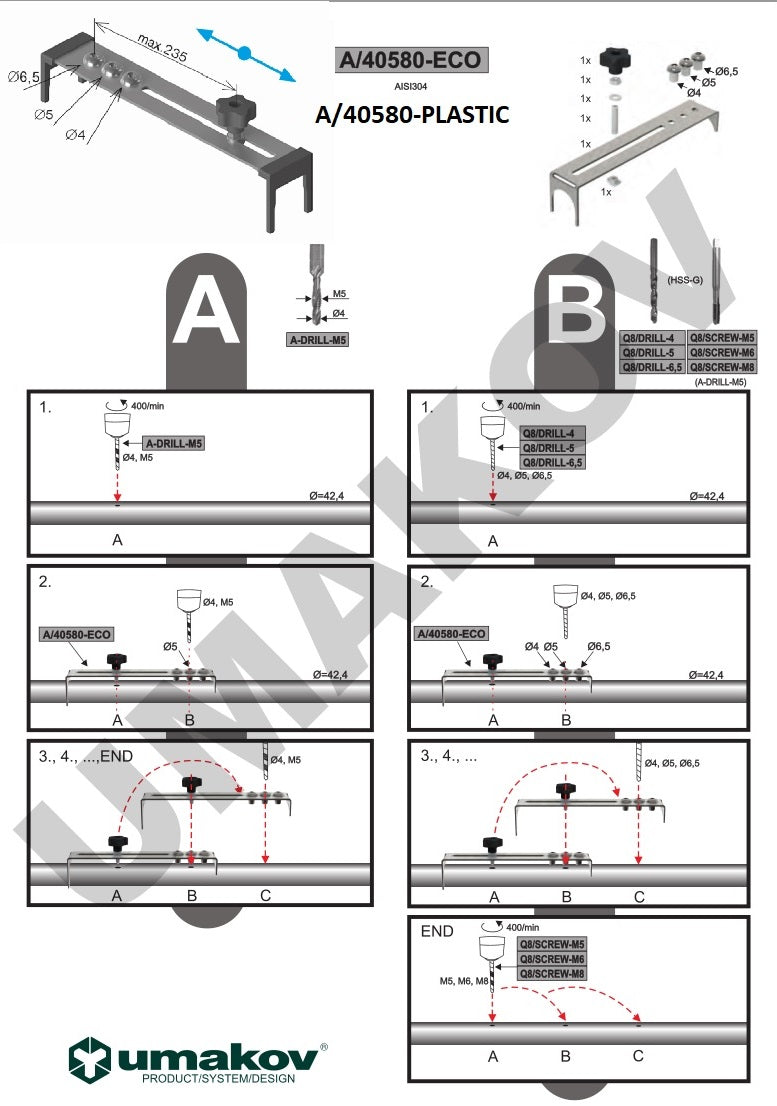 Přípravek na vrtání trubek D42,4x2mm, 40x40x2mm