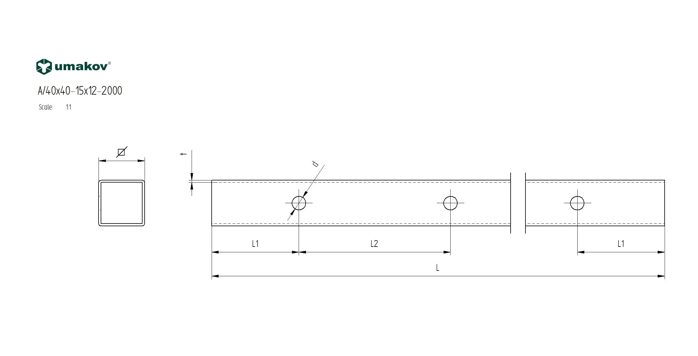 Trubka broušená AISI304, 40x40x2/15xd12,5/L1980