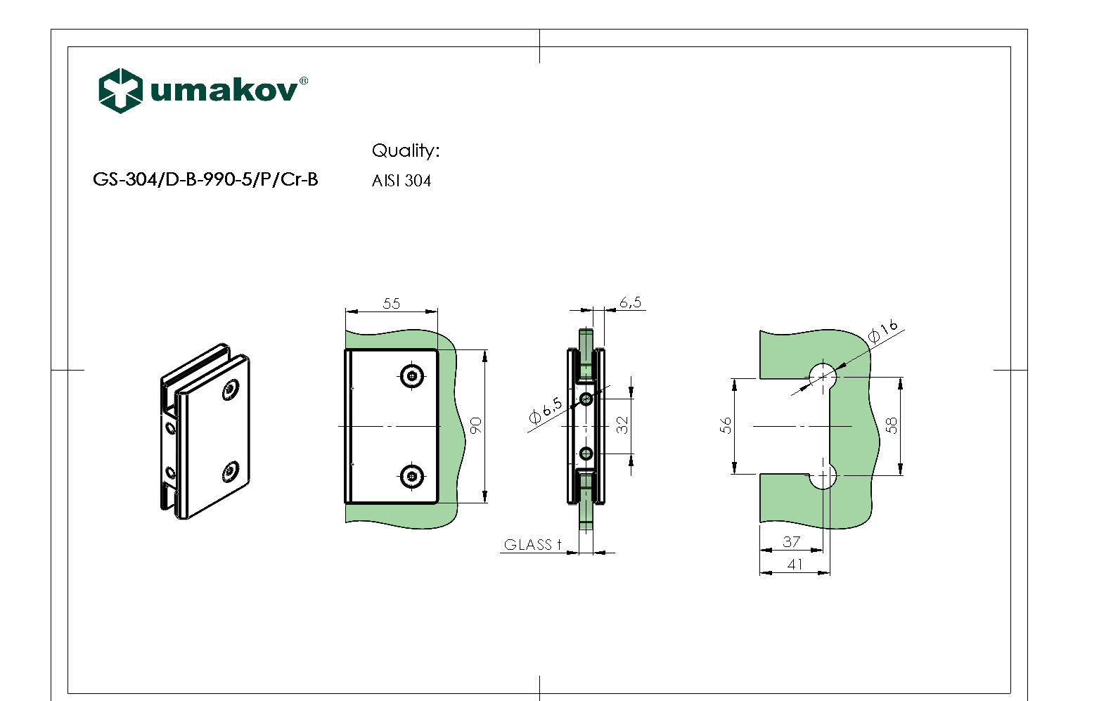 Zasklenie pevné - držiak skla na stenu AISI304 GS-304/D-B-990-5/P/Cr-B